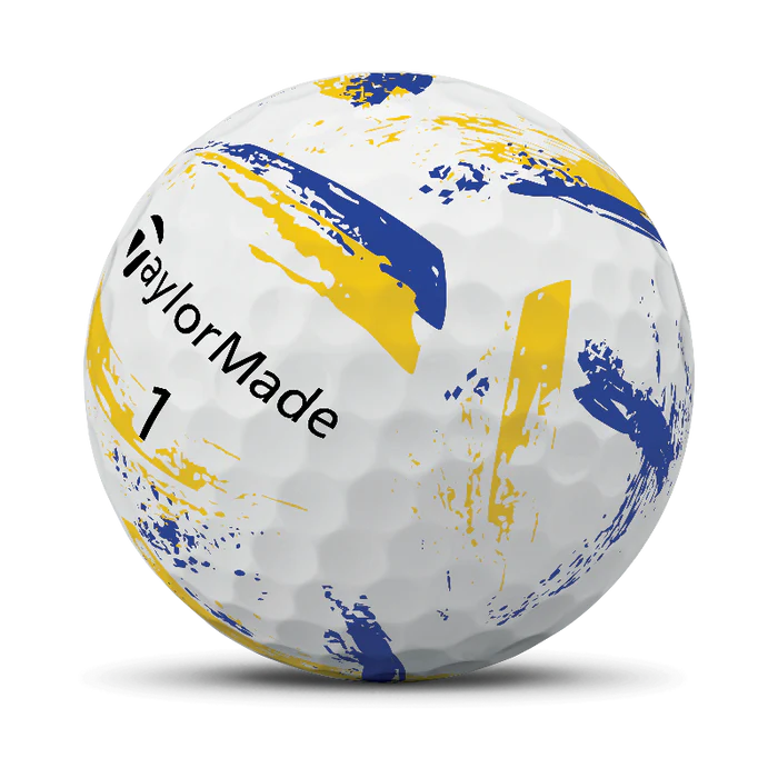 The Ink Blue/Yellow edition features striking blue and yellow paint‑splatter details. The bright design improves ball visibility on the fairway and rough. It makes spotting your ball easier.